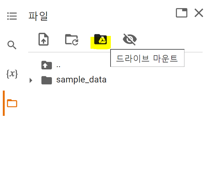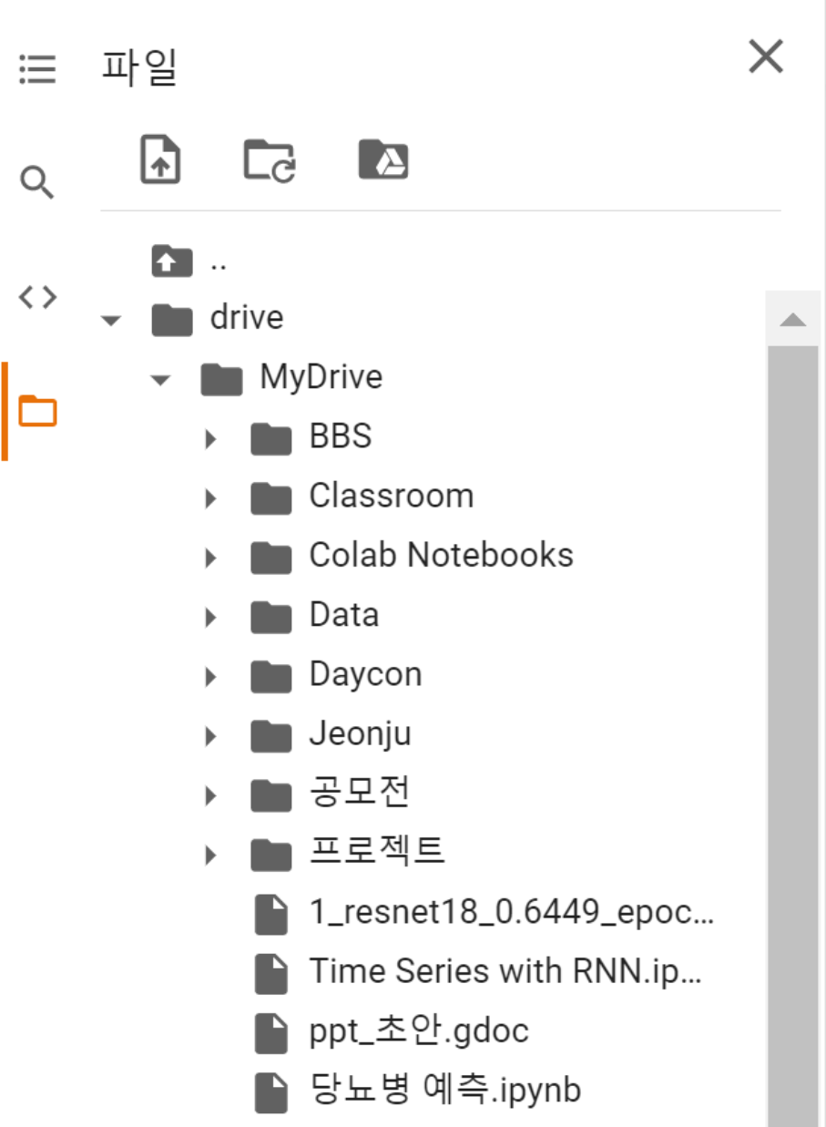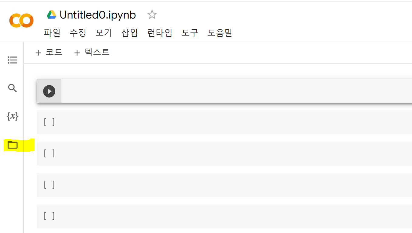 1. 구글 코랩으로 들어가서 좌측 상단에 있는 4가지 아이콘 중 가장 밑에 있는 폴더 아이콘을 누른다.