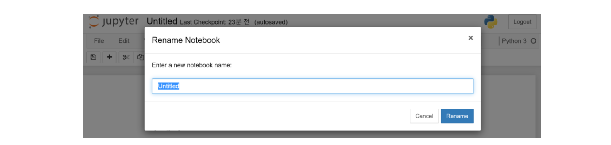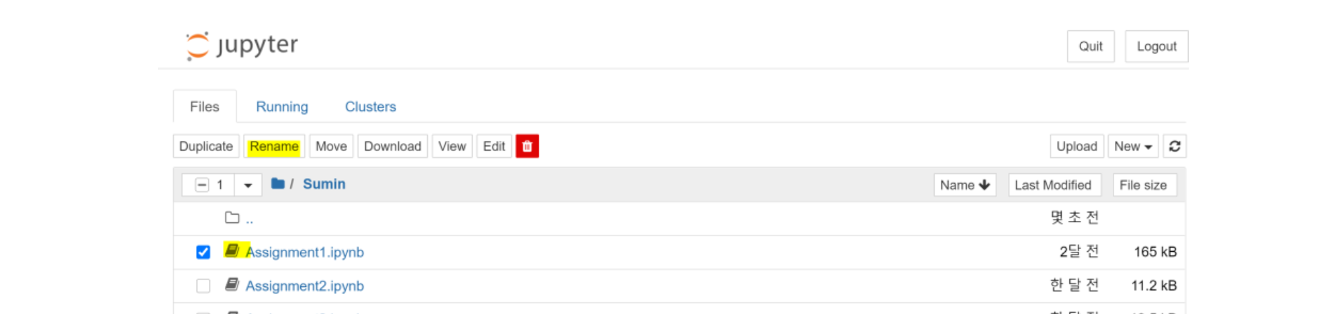 이 경우 실행중인 파일은 이름을 바꿀 수 없기 때문에 맨 앞의 노트북 모양 아이콘이 회색인 걸 확인해야한다. 만약 아이콘이 초록색이라면 실행중인 파일이라는 뜻으로, 실행을 중지하고 나서 이름을 바꿔야 한다.