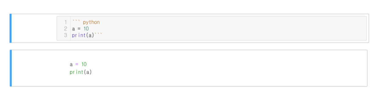 파이썬 코드와 같은 코드를 넣고 싶다면 억음부호(물결표와 같이 있는)를 세개를 넣고, python이라고 적은 후 코드를 적어주면 된다. 자바면 java, SQL 이면 sql이라고 적어주면 된다.