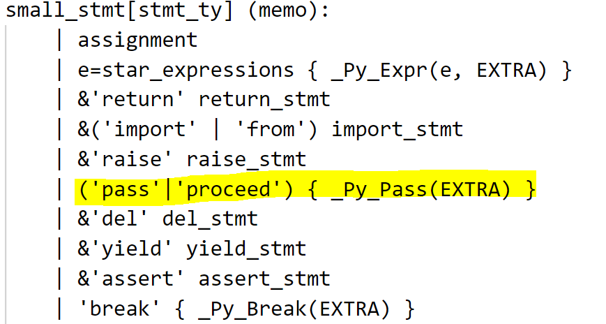 위의 문법을 참고해서 해석해보면 pass랑 proceed를 하나의 그룹으로 묶고, 그 두개는 서로 대안이 된다.