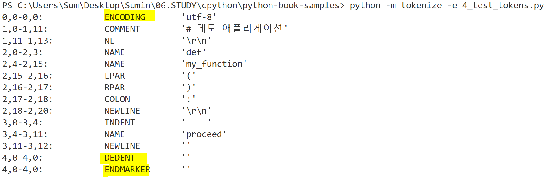 tokenize모듈은 인코딩 토큰, 함수의 정의를 마치는 DEDENT, 파일의 끝을 뜻하는 ENDMARKER등 토큰을 자동으로 추가하기도 한다.