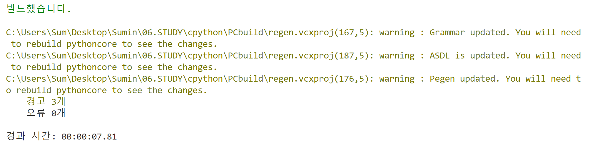 이렇게 변경한 이후 수정한 문법 파일의 빌드를 위해 터미널에서 PCbuild폴더로 이동하고