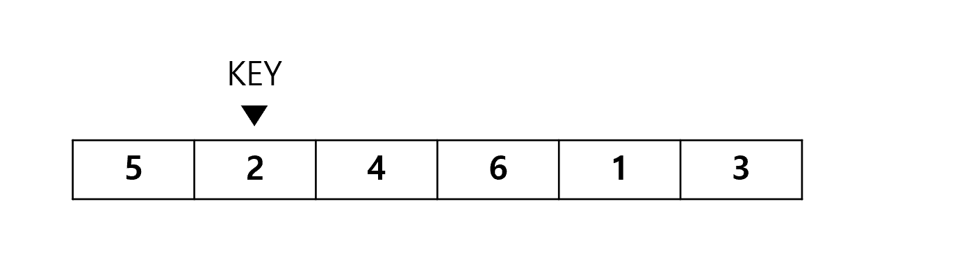 삽입정렬의 경우 두 번째 원소부터 정렬을 시작하므로 첫 번째로 선택된 key는 두 번째에 위치한 2가 된다. 이후 이 2는 앞의 원소인 5와 비교하게되고, 5와 비교했을 때 2는 5보다 작은 수이기 때문에 5가 한 칸 뒤로 오고 그 자리에 2가 위치하게 된다.