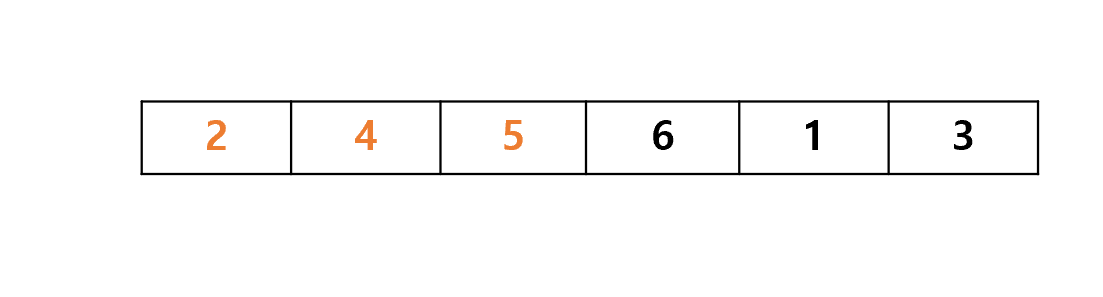 만약 array A = {5,2,4,6,1,3}일 때, 삽입정렬로 A를 오름차순 정렬을 한다고 가정해보자.