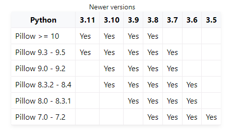 Pillow에서 지원하는 파이썬 버전은 다음과 같다.