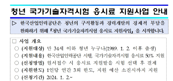 올해부터 만 34세 이하 청년에게는 청년 국가기술자격시험 응시료가 50%지원된다!