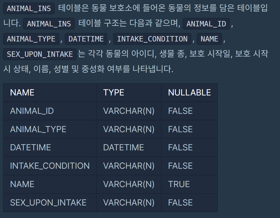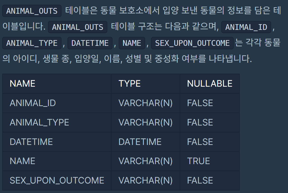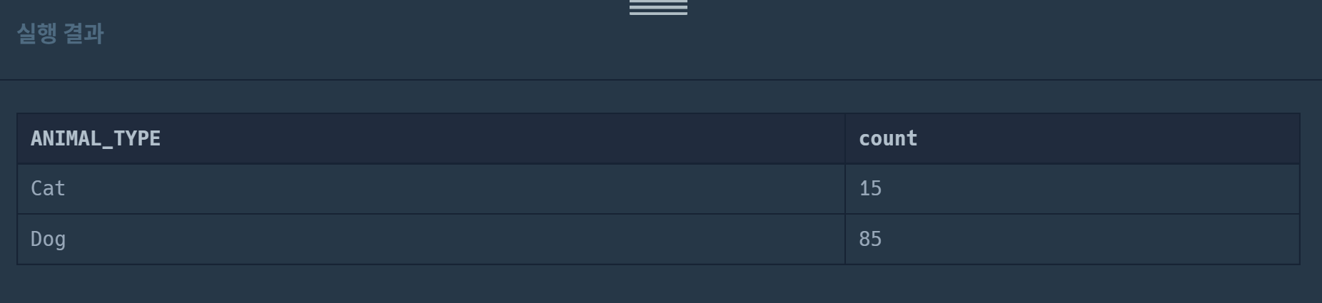 1. 몇 마리인지 count -> SELECT ANIMAL_TYPE, count(ANIMAL_ID) count