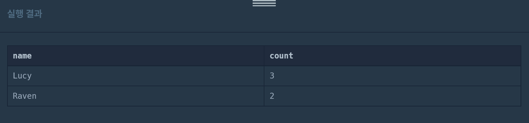 4. 두 번 이상 쓰인 이름 조건 -> HAVING COUNT(ANIMAL_ID) > 1